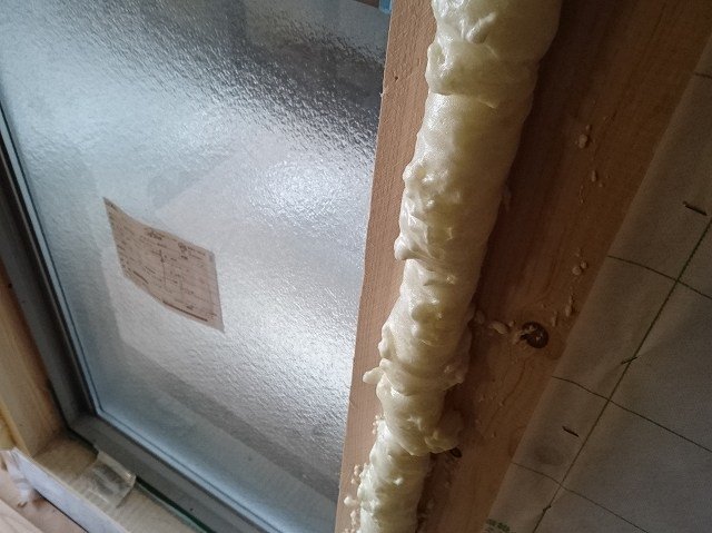 スーパージェットファイバーが充填できない窓枠と木枠のような隙間は発泡系の断熱材を入れてもらいます。